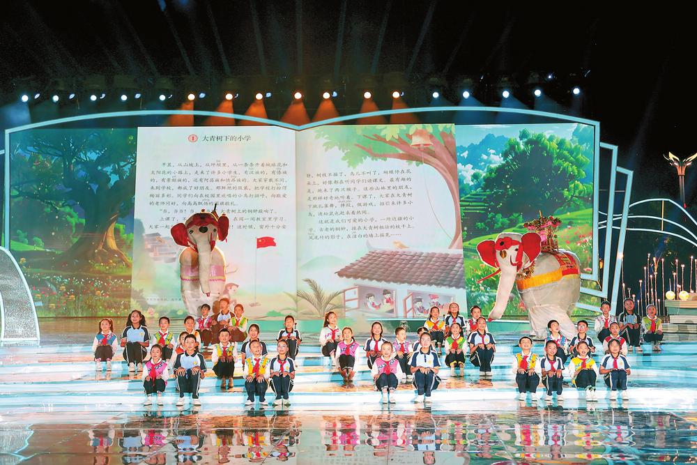 4月23日晚,第三届全民阅读大会“春风里——彩云追阅”阅读盛典在云南海埂会堂举办。图为情景演绎《大青树下的小学》。 云南日报记者 胡妤雅 见习记者 高吴双 摄