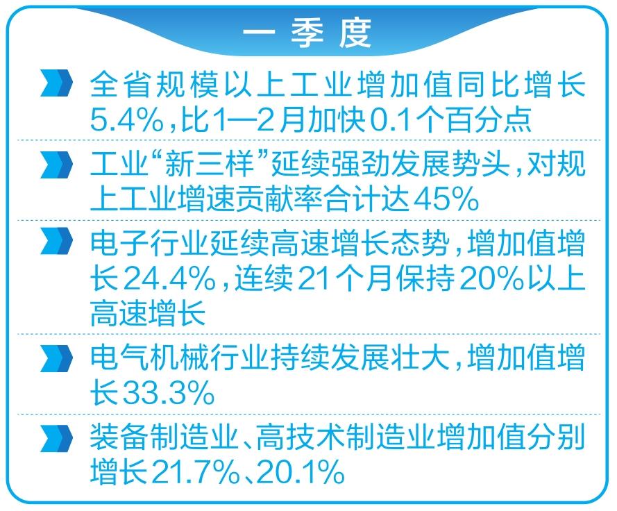 传统行业支撑有力,优势产业集聚成势,新兴产业高速增长。今年以来,我省大抓产业、主攻工业,紧紧扭住“八个关键性抓手”,聚力推进“四大支撑性工程”,加快构建现代化工业体系,工业经济稳中有进,新动能加速蓄积。统计数据显示,一季度,全省规模以上工业增加值同比增长5.4%,比1—2月加快0.1个百分点。