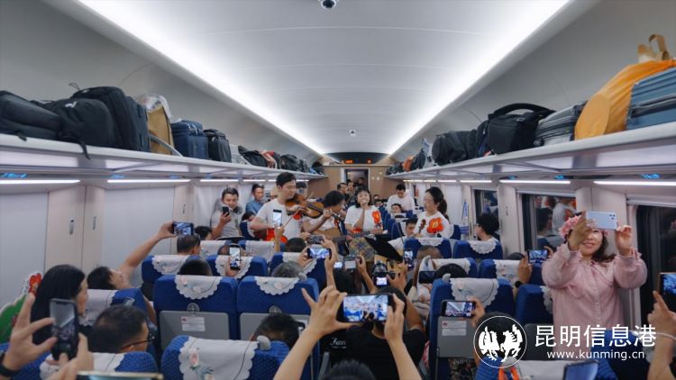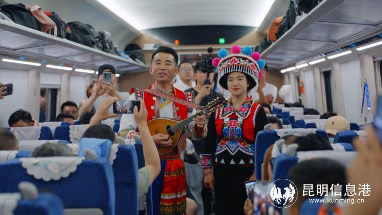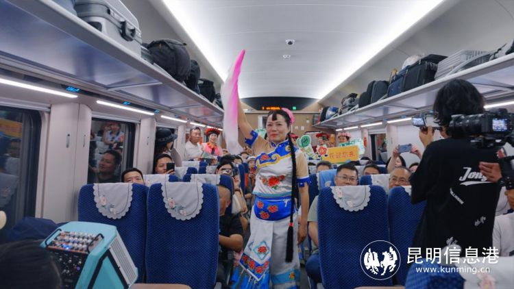 车厢内,呈贡区文化和旅游局副局长王羽萍为旅客推荐呈贡文旅资源,向国内外游客发出了花都之旅的诚挚邀请,并为游客表演花灯歌舞《魅力呈贡我家乡》,从一个侧面表现中国民间文化艺术之乡——呈贡花灯的欢快与优美,使旅客感受到了呈贡独特的民间文化艺术。