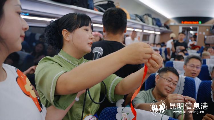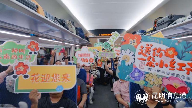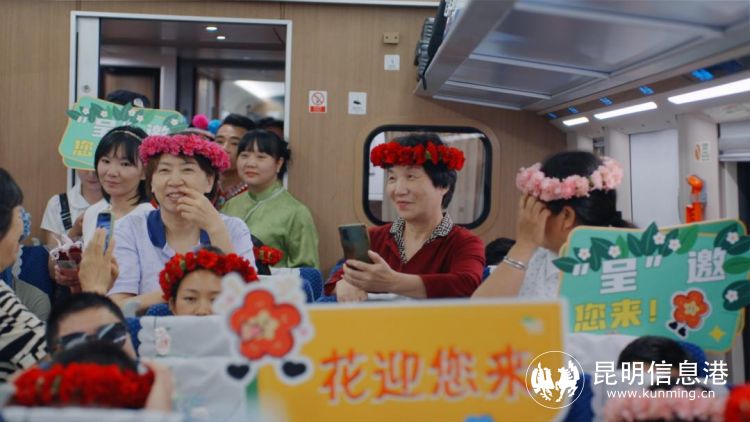 活动当天,呈贡区“小红花”花卉文旅导览员首次在本次列车中全面推介呈贡,从呈贡历史人文故事、花卉产业、景区景点等方面为旅客朋友带来沉浸式的专业讲解,不仅扩大了呈贡影响力,更是向国内外游客充分展示了云南人民的热情好客以及丰富生动的呈贡故事。