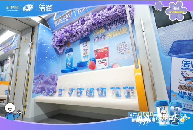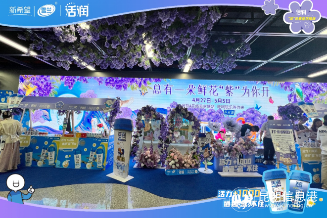 进苏家塘地铁站站厅,满眼浪漫的蓝花楹装饰格外吸引眼球。雪兰牛奶将蓝紫色的蓝花楹与旗下“蓝装”的活润酸奶相结合,在站厅打造了蓝花楹打卡墙、活润快闪店等装置,并为4号线列车特别定制“蓝花楹皮肤”,全方位营造“蓝花楹海”的沉浸体验。乘上满载蓝花楹装饰的4号线地铁,前往苏家塘地铁站,再“蓝”一杯健康好喝的雪兰活润酸奶……这一行程或将成为接下来诸多昆明消费者出行赏花的真实写照。