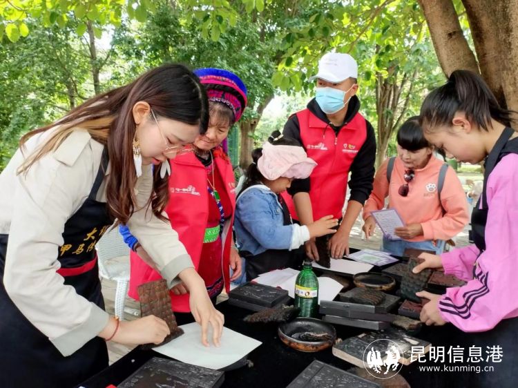 在矗立于苍山洱海之间的崇圣寺三塔,五一期间,甲马省级非遗传承人张瑞龙和市级非遗传承人张春政老师作为文旅志愿者,带领游客朋友亲手体验甲马拓印技艺,感受古人的智慧与匠心,现场指导游客完成彩绘体验。给前来游玩的旅客带来了不一样的游玩体验。