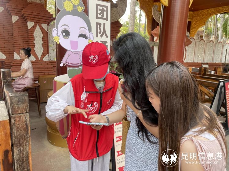 “大姨您看,这条路要先往前走,再向右转,看到一个大水车往里走,就能到目的地了。”在丽江古城,身穿“红马甲”的云南文旅志愿者正耐心地为游客讲解古城的游玩路线;在苍山下的大理三塔,同款“红马甲”正在为游客讲解当地的民俗文化风情;在西双版纳曼听公园门口,一个五六岁的小姑娘正一个人局促不安地四处张望,经过志愿者的耐心询问,原来小姑娘和家人走散了,又记不住家人的联系方式。景区的文旅志愿者一边安抚着她的情绪,给她买了零食和水,一边赶紧联系民警寻求帮助,并陪同她去往警亭等候亲人的到来。