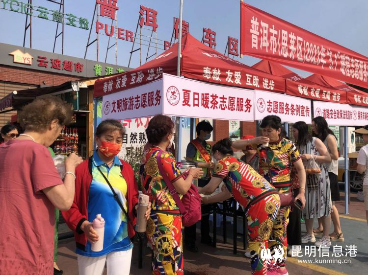 日前,多家单位在普洱市昆磨高速磨思路段普洱停车区也开展了志愿服务活动。在活动现场,身着红马甲的文旅志愿者们主动为过往司乘人员提供行车指南、免费茶水、车辆安全检测等服务,同时也宣传了普洱旅游项目、讲解道路安全政策法规、宣传健康知识和预防传染病的知识,并对司乘人员进行了安全文明出行的温馨提示,“我从青海来的,到云南感觉特别舒心,下车还有免费的普洱茶喝,交警还提醒我上路安全,真的觉得特别好。”自驾游客张先生赞扬道。