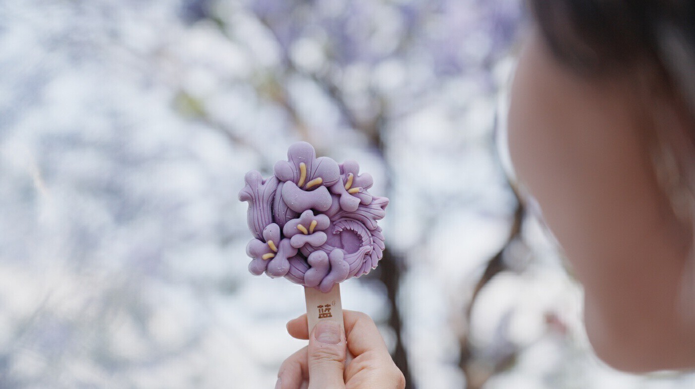 在生活美学市集上,蓝花楹元素隐藏在各个角落。除了穿上梦幻“外衣”的双层赏花巴士,还有更像蓝花楹的文创雪糕,蓝花楹冰箱贴和胸针等文创产品。号称“新中式出片神器”的非遗漆扇也配合着出了蓝花楹主题DIY体验。找到独属于自己的一份“蓝花楹+”创意,是赏花之外的惊喜。