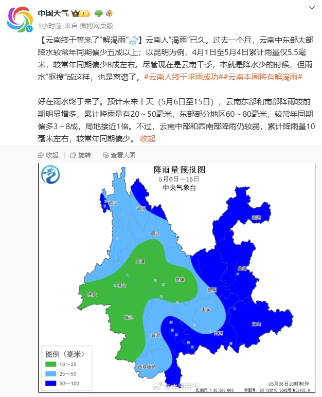 (点击查看昆明未来三天天气预报→《5月7日至9日,云南中东部将出现中雨局部大雨暴雨天气过程》)