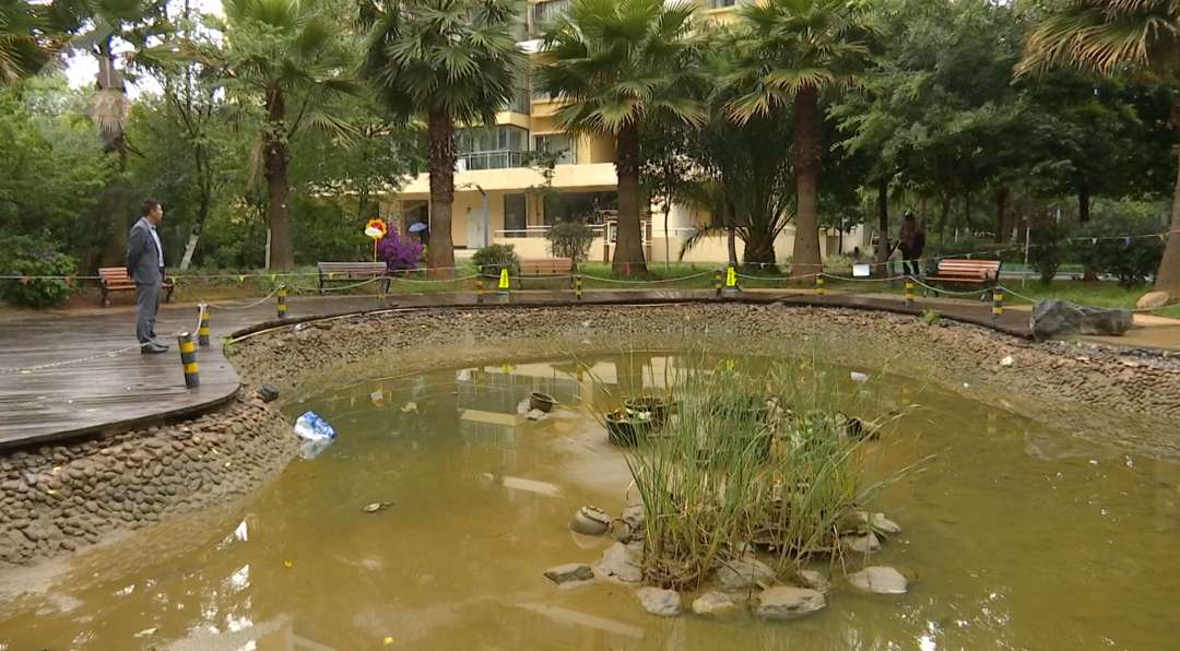 记者在银河北庭小区看到,事发地景观池仍然还拉着警戒线,只是景观池里的水几乎被抽干,还能见到池底有不少小鱼苗。