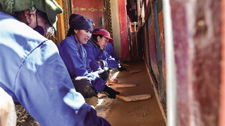 在藏式建筑工艺中,“打阿嘎”是一种用于屋顶或地面的修筑方法——将西藏特有的“阿嘎土”加上水、蜂蜜、酥油等,混合后铺于地面或屋顶,再以人工反复夯打,直到“阿嘎”平整结实。为了让地面更加光滑,工人们还会用榆树皮等反复擦拭。最终,修复后的地面与屋顶稍带浅红色,坚实、平滑、不渗水,色泽也与宫殿一致。