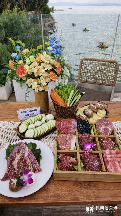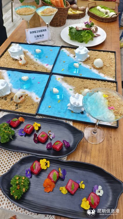 此次在海晏村首次亮相的“山盟海誓宴”,包括238元的两人情侣餐、476元的4-6人聚会餐以及10人婚宴餐,肉类、蔬菜、菌菇类、甚至昆明的鲜花一应俱全,每一道菜品不仅看样精美,菜名也都充满着浓浓的爱意,比如由蓝莓、鱼子酱和鹅肝制作而成的鹅肝慕斯,取名“蓝鱼之恋”;由烤牛肉、鸡翅、豆腐等组成的“热辣滚烫”;由玫瑰、茉莉、桂花、荷花、梅花、百合组成的“时光六味”等。一位来自老挝的留学生在品尝到甜品“蓝鱼之恋”后,惊喜地评价到,“哇,口感好丰富,在嘴里突然就爆开了。”菜品的研发创作者贝丘渔场厨师长李青阳说,这道菜品入口酸甜,咀嚼之后又能感受到鹅肝浓郁的香味,让人回味无穷。“这次的菜品主要是围绕爱情推出的山盟海誓主题套餐,作品灵感来源于每天看着滇池和蓝天白云得来,所以在色彩搭配上也非常适合拍照,用的食材都是云南特色,有鲜花、野菜、水果、五彩米饭等,主打一个小资、浪漫。”李青阳介绍。