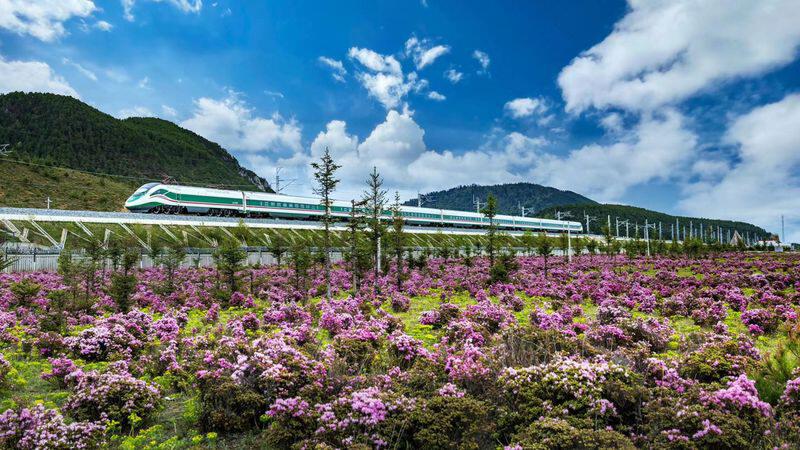 丽香铁路,满载旅客的复兴号动车组穿过杜鹃花海。(摄影:徐章位)