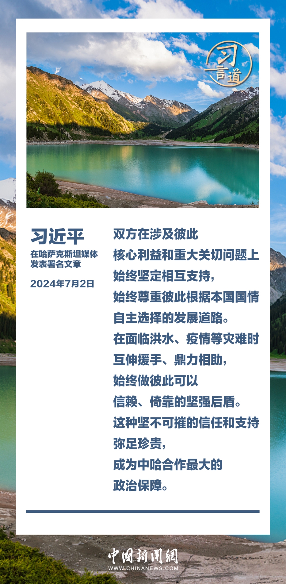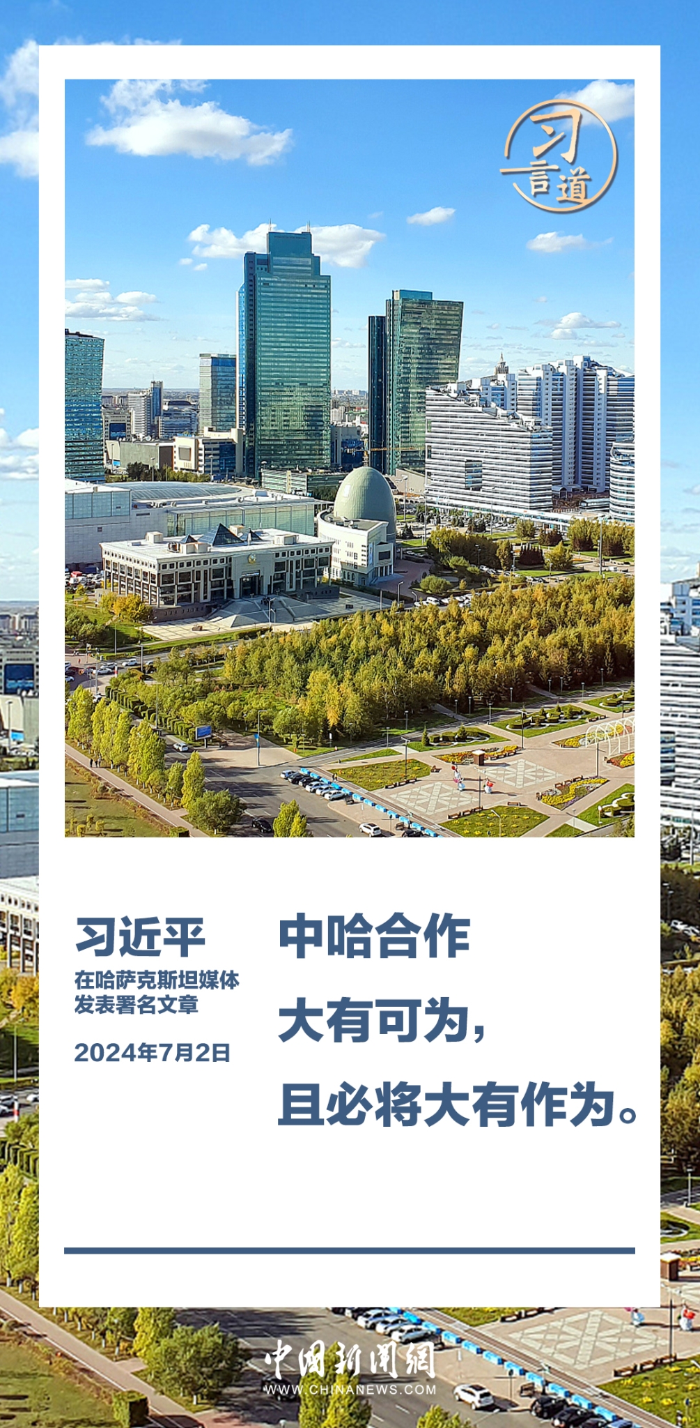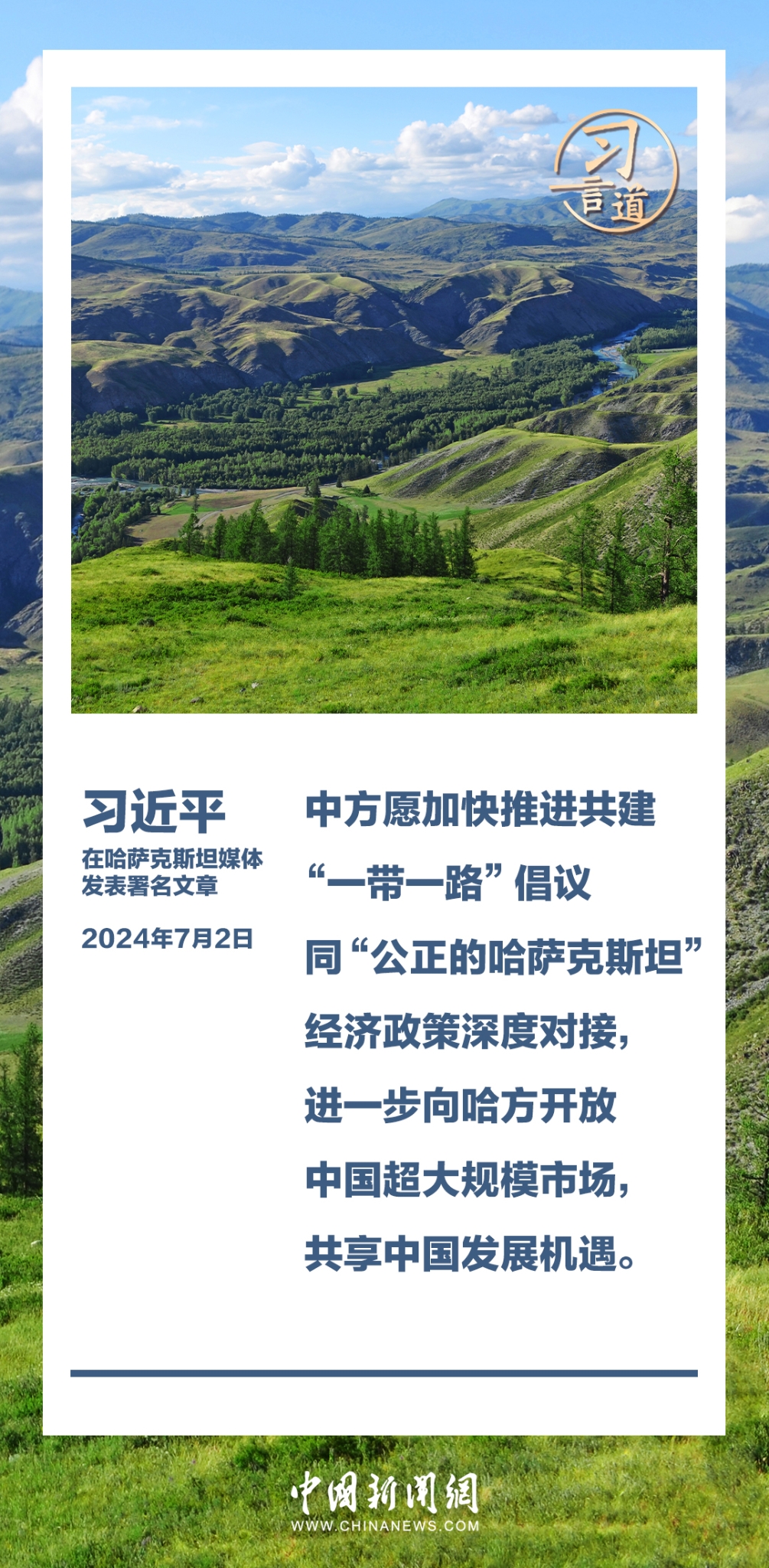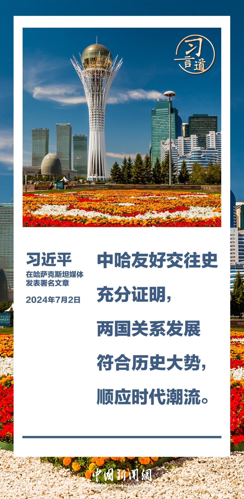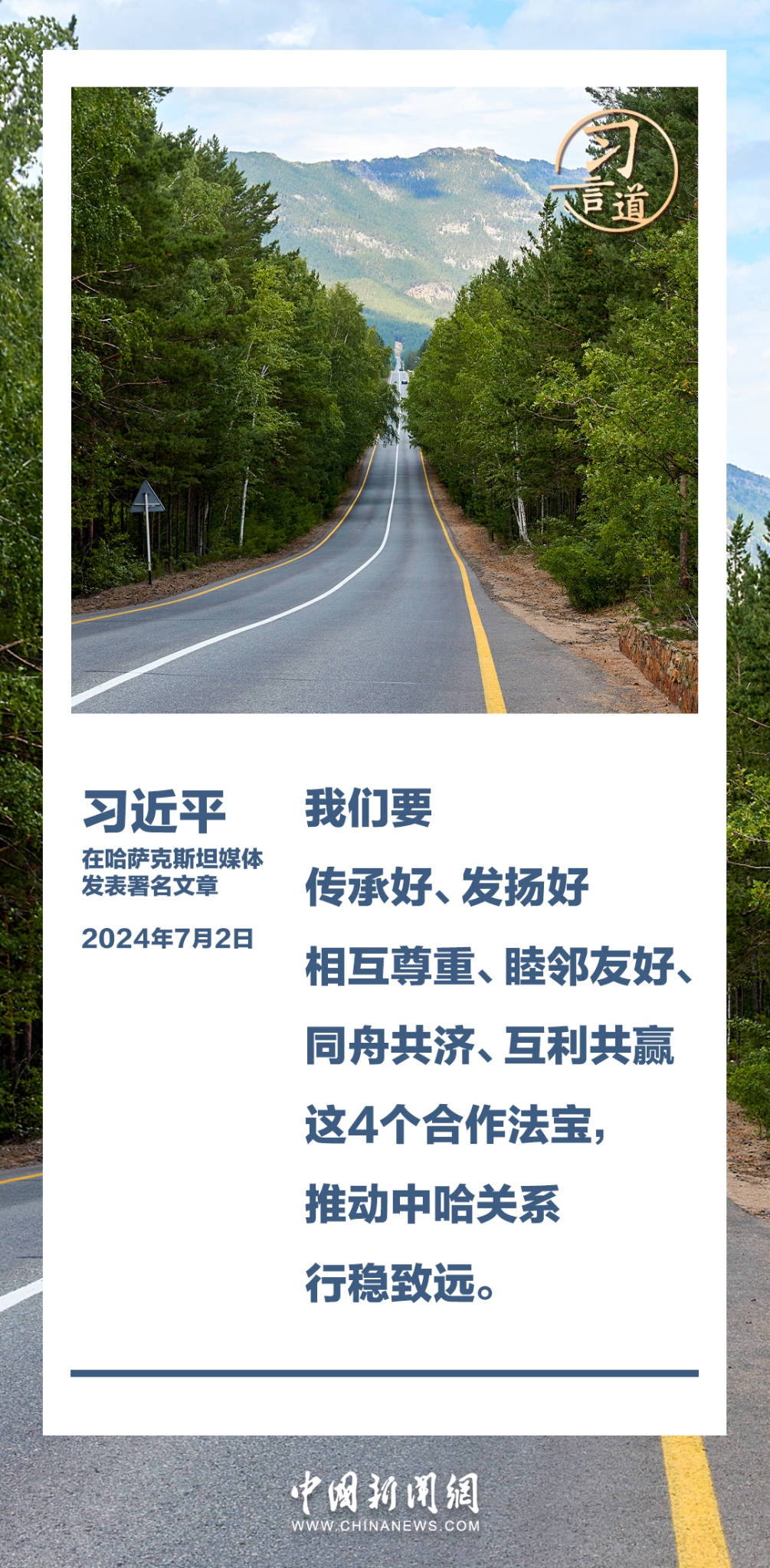 7月2日,在赴阿斯塔纳对哈萨克斯坦进行国事访问之际,国家主席习近平在《哈萨克斯坦真理报》、哈萨克国际通讯社发表题为《同心笃行 续写中哈关系新篇章》的署名文章。习近平指出——