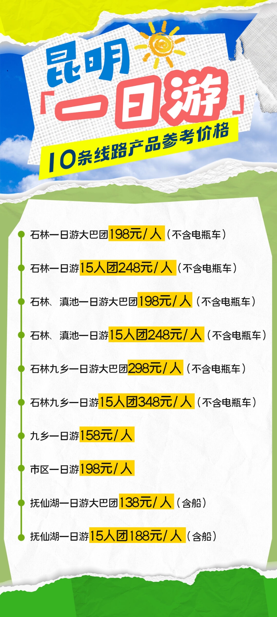 一日游产品参考价格由昆明市旅行社行业协会及相关一日游旅行社进行市场调研后确定并发布,包括10条昆明及周边一日游主力线路产品。