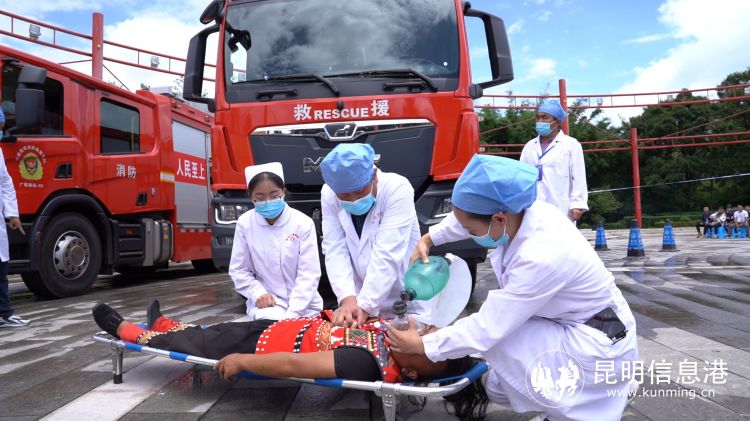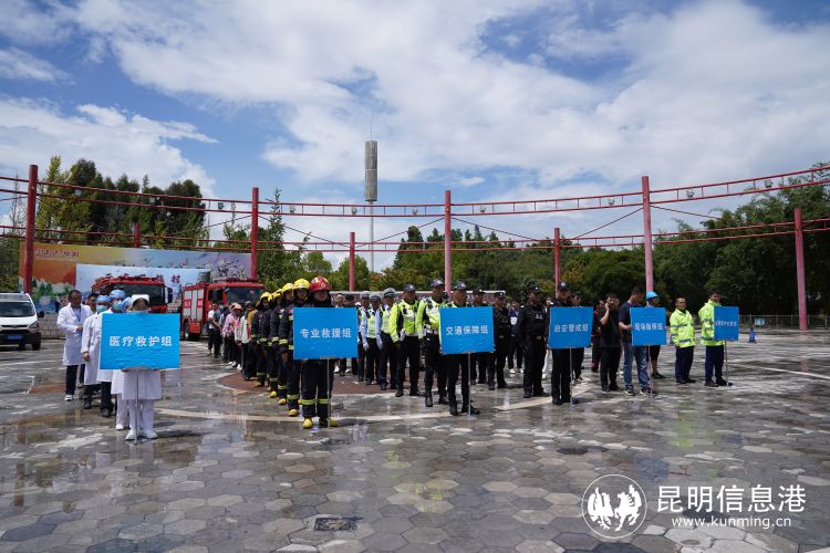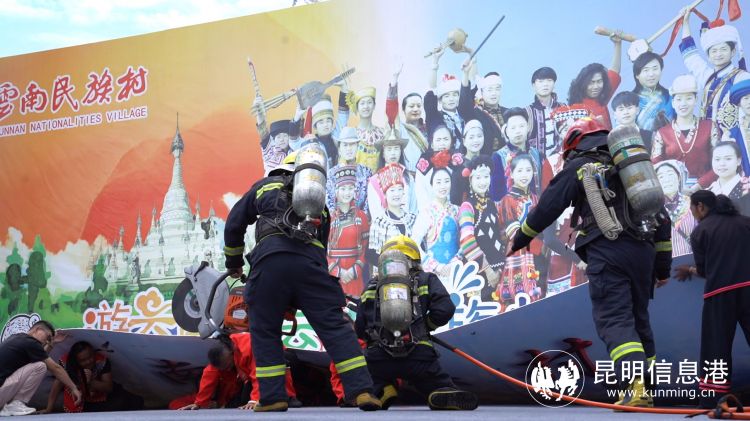 本次演练模拟云南民族村举办某大型活动期间,舞台突然坍塌,2名表演人员被困事故应急救援场景。演练中,现场负责人按照流程,开展内部应急救援并逐级上报事故,内部救援无效后请求度假区应急救援,总指挥宣布启动应急救援预案。启动命令下达后,由城市管理局(应急)、公安分局、交警八大队、消防救援大队组成的4个工作组立即前往事故现场,展开现场应急处置、进行疏散人员撤离、对事故现场进行管控和劝导、对伤员进行撤离施救等工作,在各工作组的协同作战、齐心协力和默契配合下,演练成功完成。