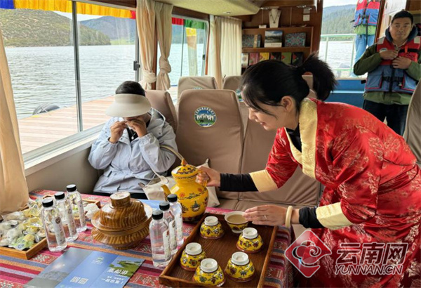 航线游船全部使用新能源动力,生态环保,外观设计与景区生态相契合,内饰融入了当地藏文化元素,码头和停靠点干净舒服、环境优美,并设有藏民族锅庄表演,航线全程为游客提供民族文化和自然风光的多元化讲解服务,游客在游览途中还可品尝藏族酥油茶、奶酪等民族特色美食。