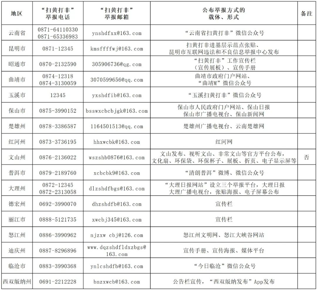 云南省各地“扫黄打非”线索举报方式