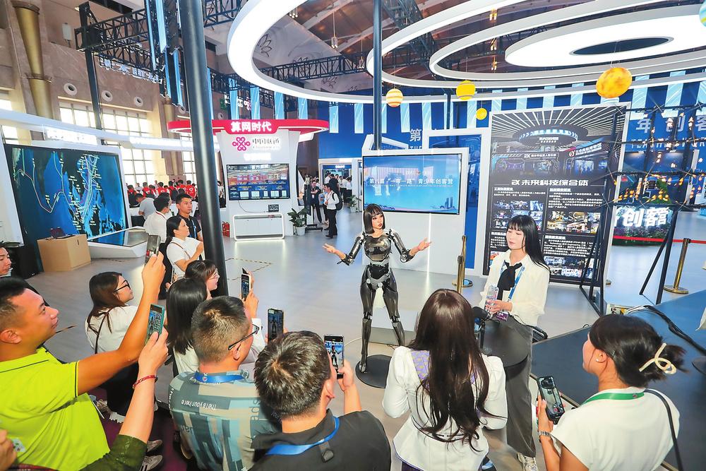 “一带一路”青少年科技人文交流成果展上,观众与AI人形机器人互动。见习记者高吴双/摄