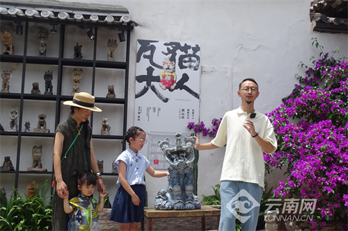 7月20日,在大理白族自治州巍山彝族回族自治县巍山古城内,青年艺术家王子强和李萍的“瓦猫大人”作品展在一座古朴的院落内开幕。这次展览展出了7个系列300件左右作品,展览持续至8月20日,面向公众免费开放。