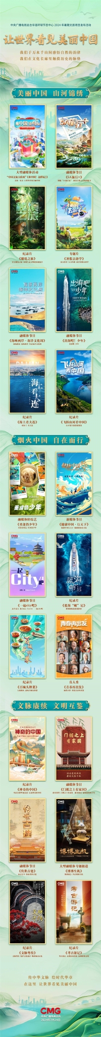美丽中国,山河锦绣。中法合拍8K超高清影像,记录《神奇的中国》;跟随《5A旅行+》感受自然与文化的魅力;开启《秘境之旅》,展现生态文明建设新篇章;博博盛会,共话未来博物馆的《博博生机》;读万卷书,行万里路,趁着《暑假去游学》;致敬奥运荣光,《重逢仍少年》;科普传播新范式,《健康中国·行天下》,健康新知传万家。