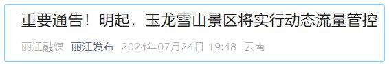 2024年7月25日—8月31日,玉龙雪山景区将在入园分时预约、分区游览和分片管控的基础上,经综合研判玉龙雪山景区每日天气实况、交通状况、停车场容量、实时游客接待量和瞬时承载量、大数据分析结果等情况后,景区将提前在官方微博发布相关提示,适时对未提前预订景区各类票种且尚未进入景区的游客采取分流、控流和限流等疏导措施,确保景区游客流量控制在安全有序范围内。