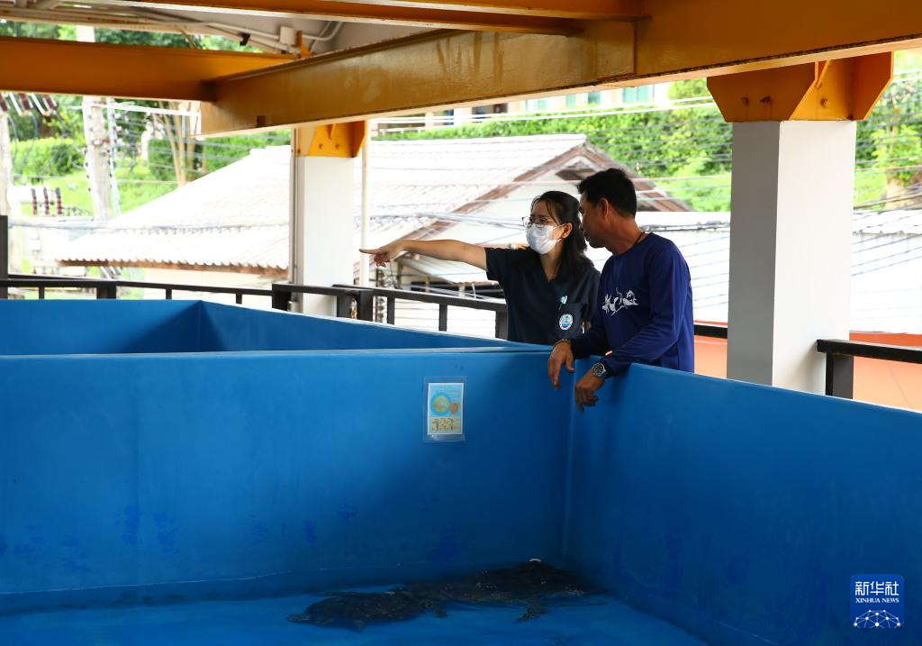 7月23日,在泰国普吉海洋生物中心,工作人员站在被救助的海龟旁。新华社记者 孙玮彤 摄