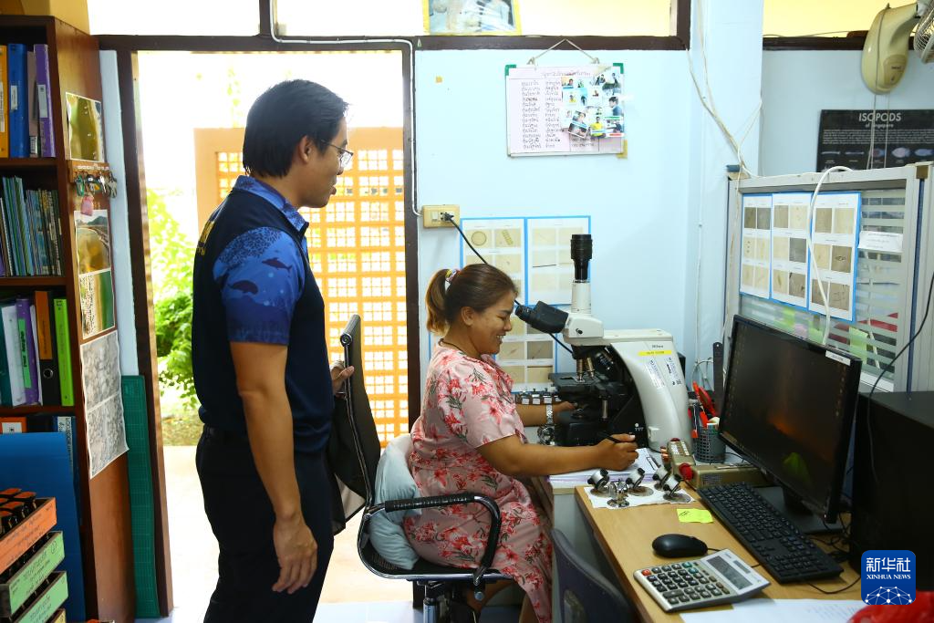 7月23日,在位于泰国普吉的中泰气候与海洋生态系统联合实验室,差林拉·桑马尼(左)与工作人员交谈。新华社记者 孙玮彤 摄