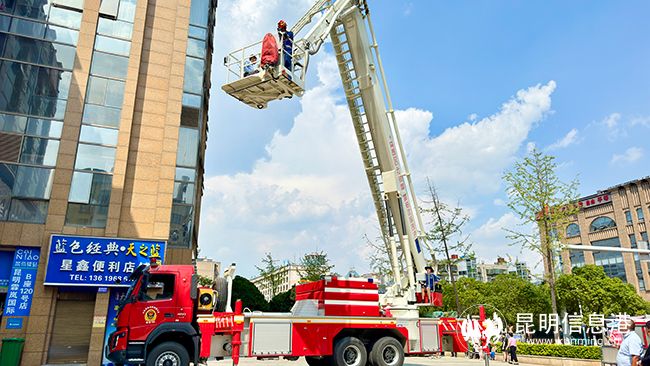 在火灾扑救实战演习中,模拟霖岚国际广场写字楼内发生火灾,火势蔓延迅速,内部有2人被困,现场情况危急。接到报警后,盘龙区消防救援大队派出多支救援力量赶赴现场,全力排查、营救、疏散被困人员,并部署云梯车转移窗边呼救人员。