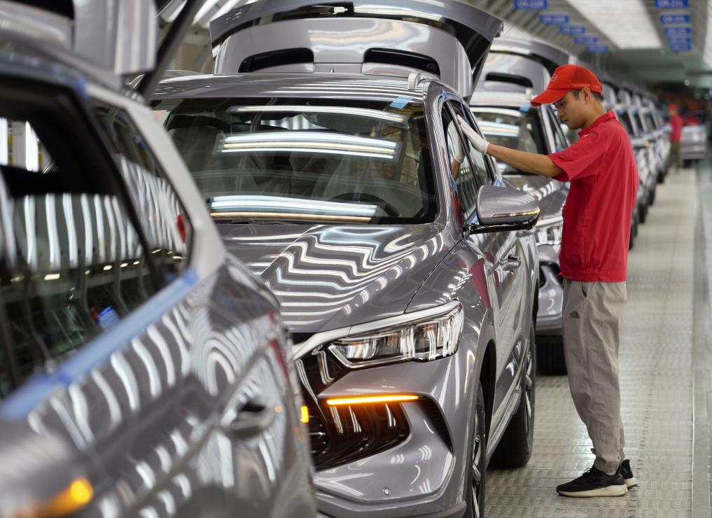 2024年4月24日,工人在位于河南省郑州市的郑州航空港区比亚迪总装工厂新能源汽车“宋Pro”生产线上对车辆进行质检。新华社记者李嘉南摄