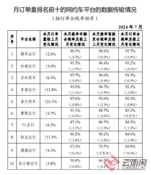 8月28日,交通运输部发布“网约车监管信息交互系统发布2024年7月份网约车行业运行基本情况”显示,在各主要中心城市中,昆明网约车订单合规率排在36个城市中的第30位。