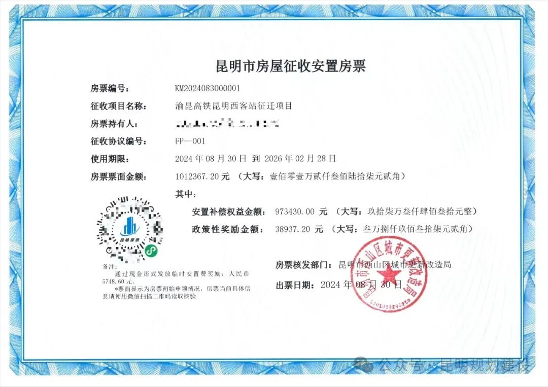 西山区城市更新改造局在渝昆高铁昆明西客站征迁项目核发的第一张房票,也是昆明发放的首张房票。已发放的房票凭证载明征收项目名称、房票持有人、房票票面金额及政策性奖励金额、使用期限等信息,票面金额为101万余元。