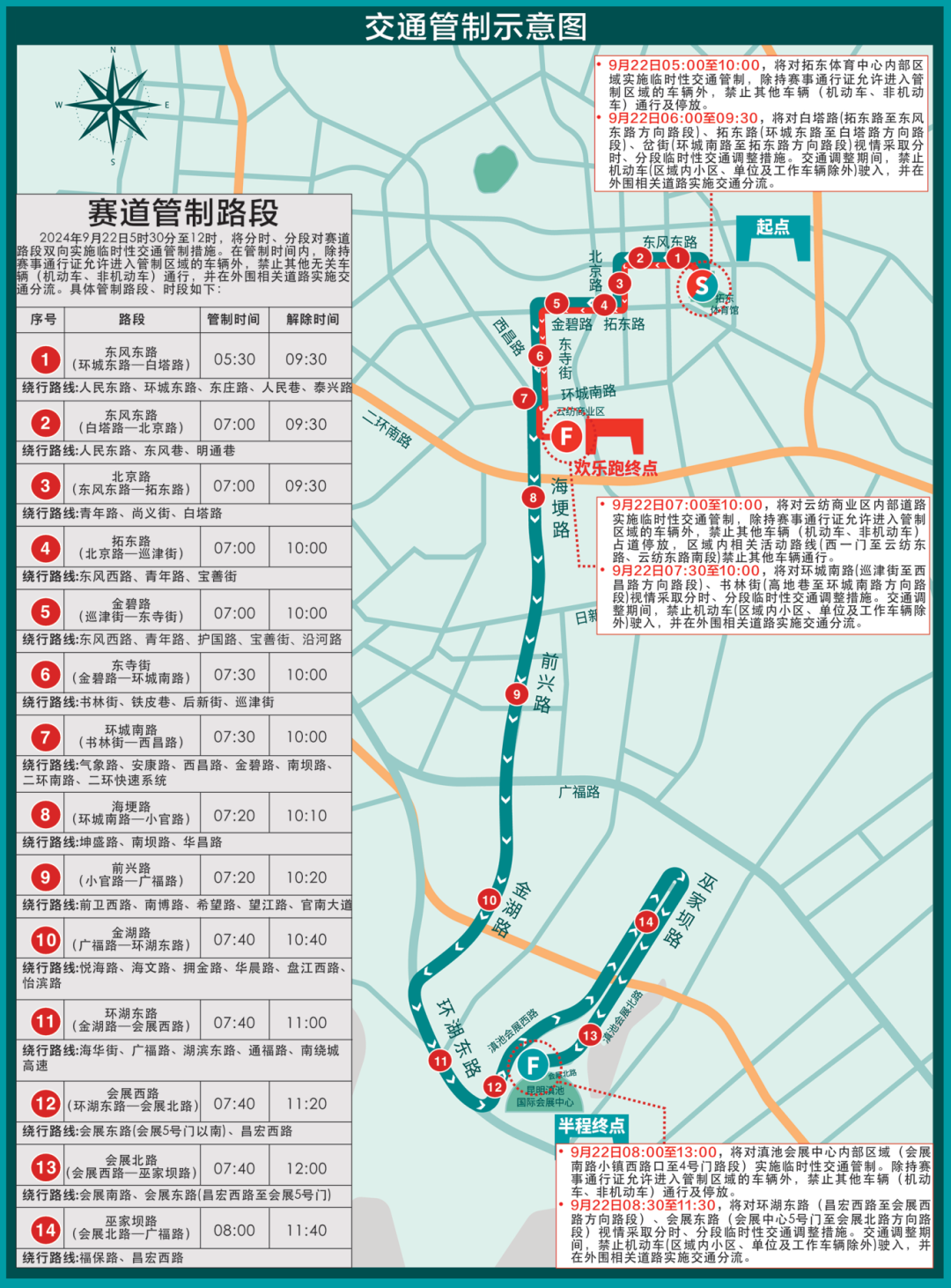 9月22日5:30至12:00,将分时、分段对赛道路段双向实施临时性交通管制措施。在管制时间内,除持赛事通行证允许进入管制区域的车辆外,禁止其他无关车辆(机动车、非机动车)通行,并在外围相关道路实施交通分流。具体管制路段、时段及绕行路线如下: