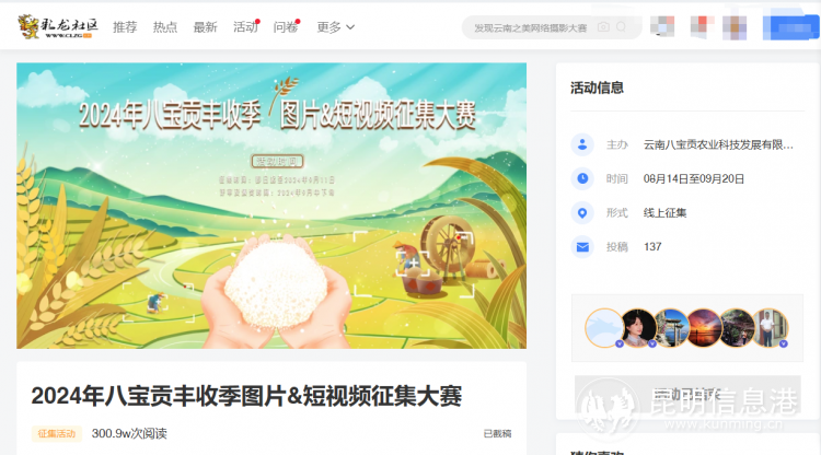 此次大赛由云南八宝贡农业科技发展有限公司联合6686体育彩龙社区主办,大赛汇聚省内外创作者,同时吸引到网络大V、摄影达人、旅游博主、美食博主等参与,旨在弘扬传承中华优秀农耕文化,庆祝劳动人民的辛勤耕耘。此次比赛拍摄主题分为“八宝贡米溯源之旅”和“把有机稻田搬进昆明”两个主题,邀请摄影师们分别到八宝镇记录下好山好水好稻田,以及到南亚风情第壹城探索巨型稻草人如何与城市繁华景象相融合。