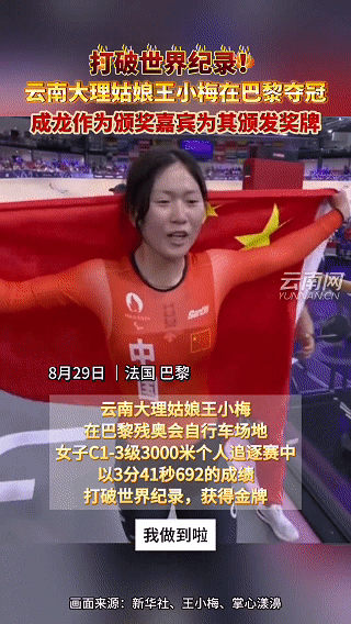 8月29日,云南大理姑娘王小梅在巴黎残奥会场地自行车女子C1-3级3000米个人追逐赛中打破世界纪录,勇夺第一,为中国代表团赢得巴黎残奥会第二枚金牌!