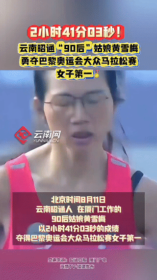 8月11日,2024巴黎奥运会大众组马拉松鸣枪开跑,来自云南昭通90后姑娘黄雪梅以2小时41分03秒的完赛成绩,成为全场第一位冲过终点线的女选手,夺得巴黎奥运会大众马拉松赛女子组冠军。