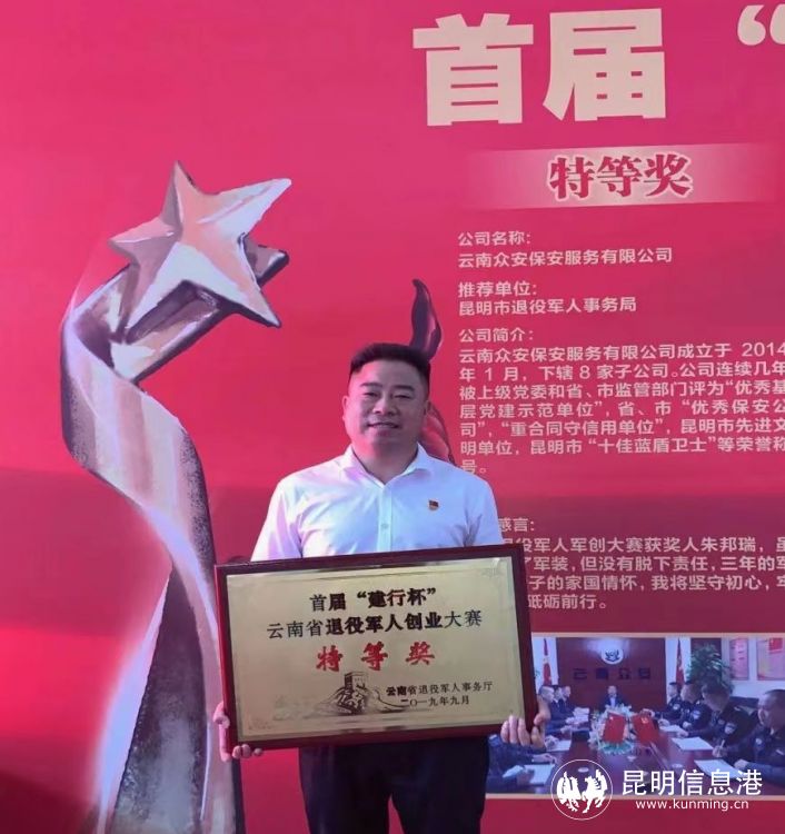 告别军营后,朱邦瑞只身闯荡北上广深,遭遇艰难挫折,历经千辛万苦,他始终没有放弃理想信念,屡败屡战、愈挫愈勇,于2014年带领两名退役军人成立了云南众安保安服务有限公司。在部队接受党组织多年的教育,让他深刻领会到党组织战斗堡垒和党员先锋模范的巨大作用,可以成为企业凝心聚魂、助推发展的强大精神动力。为此,在众安成立之初,就成立党组织,秉承“党建引领、军旅铸魂、狼性团队、同心共赢”的发展方针,坚持“安全留给客户,风险我们承担”的服务宗旨,以“促进地方经济发展、维护社会稳定”的发展导向,积极响应政府号召,成功打造了一个传承部队优良传统、根植军人血性,弘扬军魂、传承军魂、践行军魂,有担当保激情的军创企业。经过苦心经营,公司由原来的人防保安公司发展成为技防、消防、人力、物业、教培、环保等12家子公司的集团企业,现有员工8000余人,年营业额近3亿元,业务覆盖云南12个州市,累计带动就业17万余人,自创业以来累计上缴利税4000余万元。
