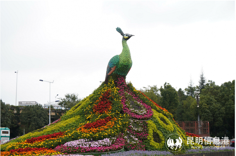 呈贡区除传统的道路摆花外,在斗南花市片区及金桂街沿线小游园打造新的城市摆花点和道路景观;在瑞香西街和兴呈路交叉口摆放云南特有绿孔雀立体花坛,造型灵动、主题突出、色彩丰富;在和谐路与锦绣大街交叉口布置“开放昆明,欢度国庆”主题斜面花墙。