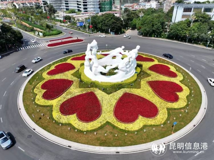 度假区在滇池路七公里转盘绿地民族团结的雕塑周边布置以“万众一心”为主题,红、黄为主色调的心形模纹花坛,象征着各族人民团结一心、共同奋斗,营造热烈而庄重的国庆氛围;西海路沿线小游园及时更换时令花卉,优化道路景观效果。