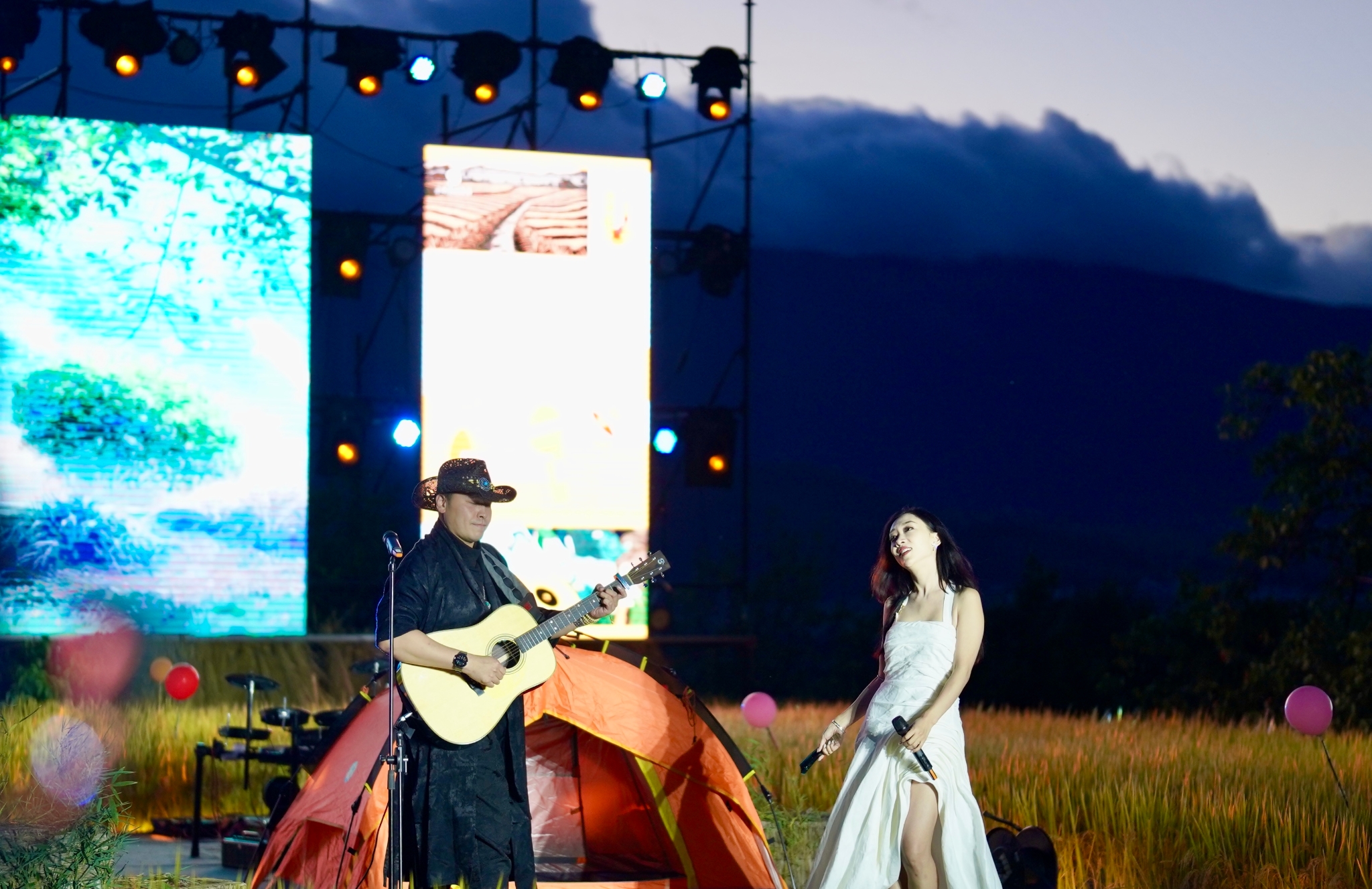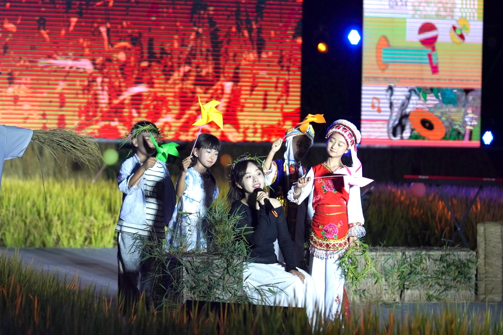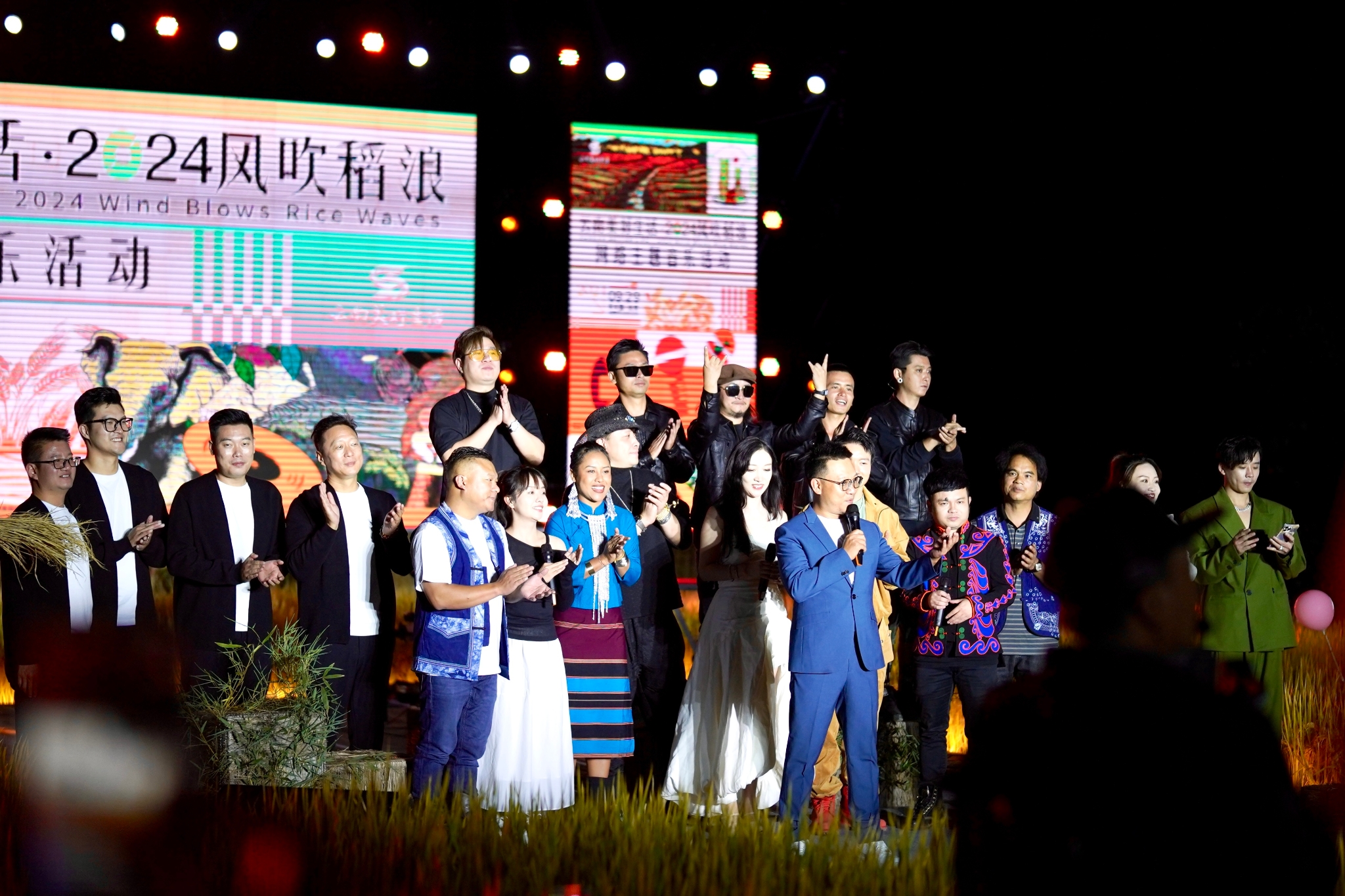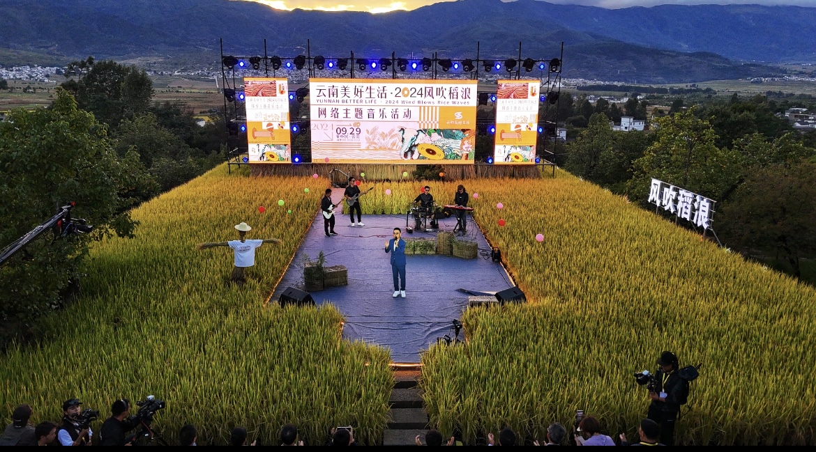 随着夜幕降临,“空中稻田剧场”变成了欢乐的海洋,音乐的高潮一浪接一浪,云南本土乐队苍山之子、中国流行男歌手白玛多吉、短视频作品在网络获得近10亿次播放量的音乐人郝浩涵等10余名国内知名歌手以及杨晚笛、杨叶伦、李维真等具有影响力的实力唱将齐聚现场深情献唱,带来的《梦回云南》《蝶恋》《风吹稻浪》《唱着情歌去大理》等一首首富有节奏、充满民族特色的歌曲将现场的气氛推向了高点。欢快的节奏展现出了丰收的喜悦,传统的民族音乐在活动现场奏响,悠扬的旋律回荡在稻田上空,让人们仿佛置身于一幅美丽的乡村画卷之中。