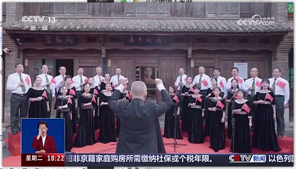 在距离云南昆明千里之外的湖南长沙田汉故居前,长沙市雨花区水电友好合唱团也用庄重嘹亮的国歌声,唱出了中华民族刚毅不屈的民族精神。一群朝气蓬勃的孩子也加入到国歌合唱当中,以稚嫩的童声,向先辈致敬,为祖国祝福。