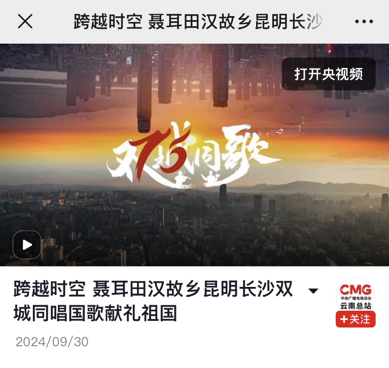 “在国歌曲作者聂耳和词作者田汉的出生地,云南昆明和湖南长沙,两地以空中音符为纽带,赓续红色血脉,双城合唱团联动,同频共振,唱响国歌,歌声在空中回荡,既是向先辈致敬,也传递着人们对祖国的无限热爱与真挚祝福……”10月1日,中央广播电视总台新闻频道《共同关注》栏目报道了由昆明市融媒体中心发起的“跨越时空 双城同歌”音乐快闪活动。