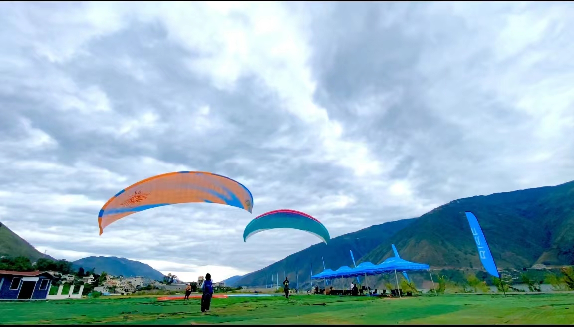 特技表演后,全体学员们带上装备乘车到达大朵起飞点,在教练的指导下,助跑、起飞、盘旋......一架架滑翔伞轻柔地翱翔在蓝天白云之间,与风嬉戏、与鸟共舞,彰显浪漫与自由。