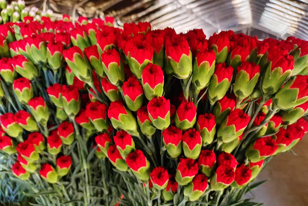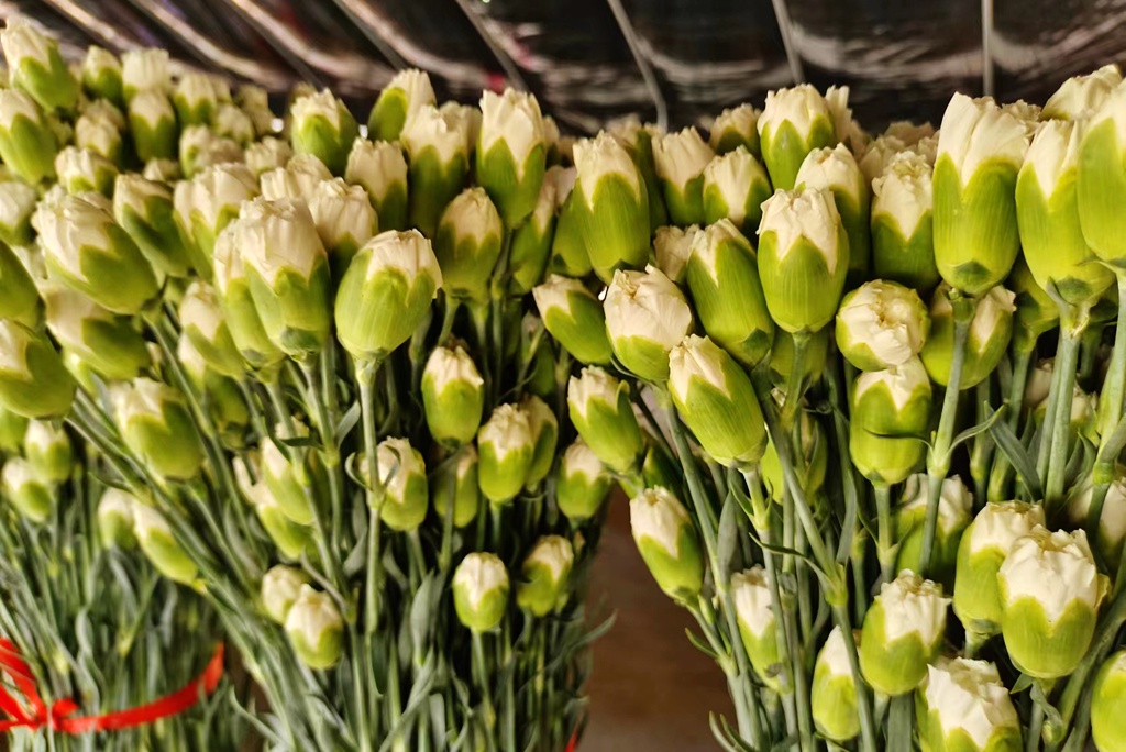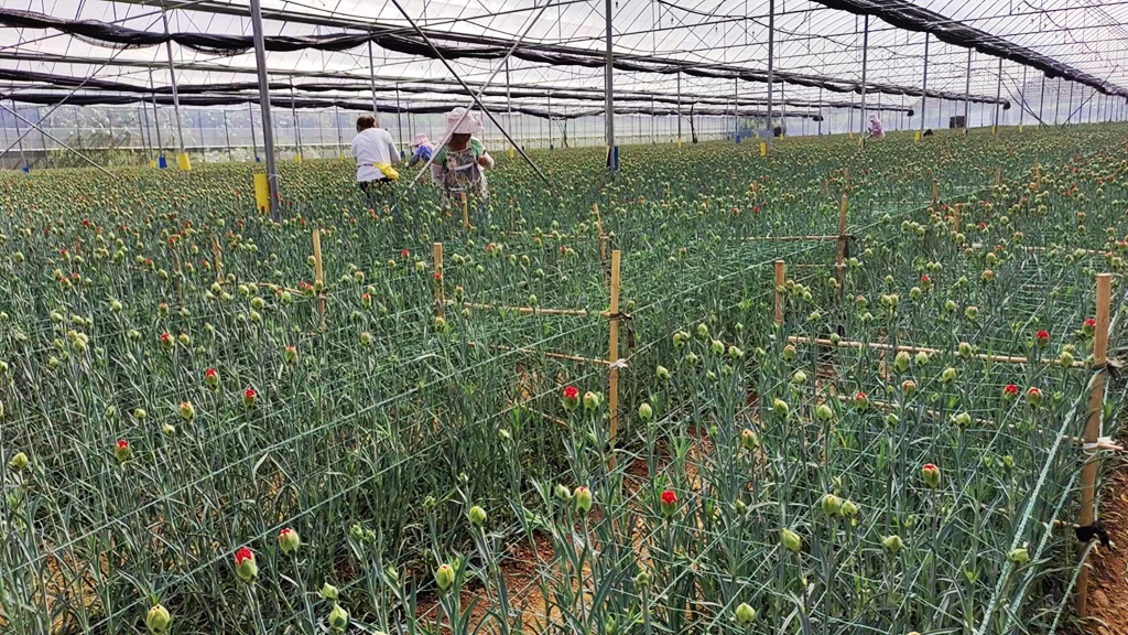 据悉,成熟的鲜花从7月20号开始采收,可持续至9月底,随即进行清桩、松土、追肥等工作,培育下一批康乃馨,预计年底可上市。