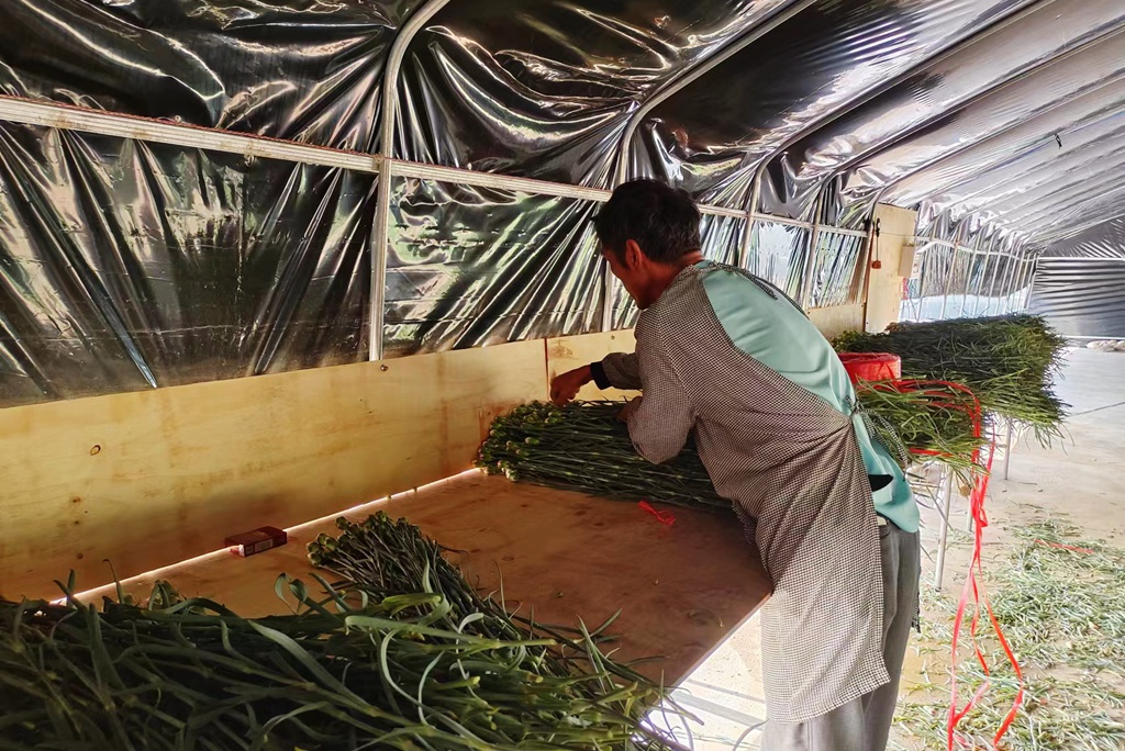 在新民村康乃馨种植基地,大棚整齐排列,今年4月份种下去的康乃馨株株齐高、含苞待放,淡淡花香扑鼻而来,花农们正在采收可以上市的鲜花。