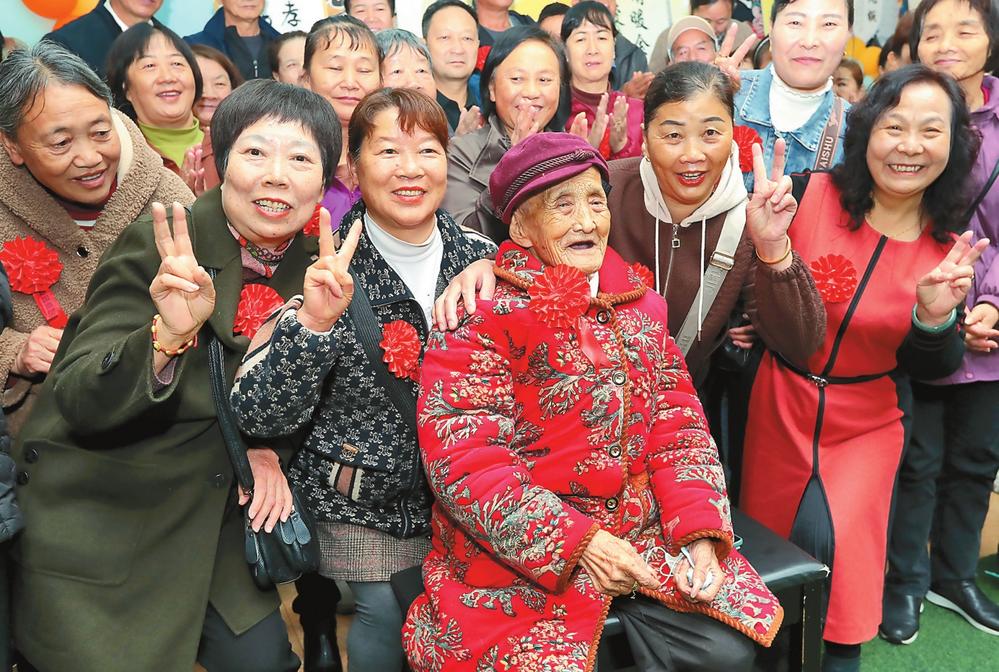 10月11日,昆明市西山区白马西区社区携手白马幼儿园举办以“夕阳有余晖 彩霞撒满天”为主题的系列重阳节敬老活动。幼儿园为老人们准备了重阳节慰问卡,师生们为老人献上精心排演的节目。参加活动的人们纷纷和101岁高龄的老人张时芬合影留念。本报记者 杨峥 摄