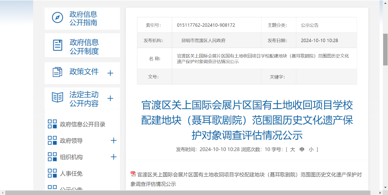10月10日,官渡区人民政府官网发布了“官渡区关上国际会展片区国有土地收回项目学校配建地块(聂耳歌剧院)范围图历史文化遗产保护对象调查评估情况公示”,根据公示,聂耳歌剧院土地收回项目,已启动历史文化遗产调查。记者了解到,聂耳歌剧院所在的展馆地块将被收回,拆迁后将新建学校。