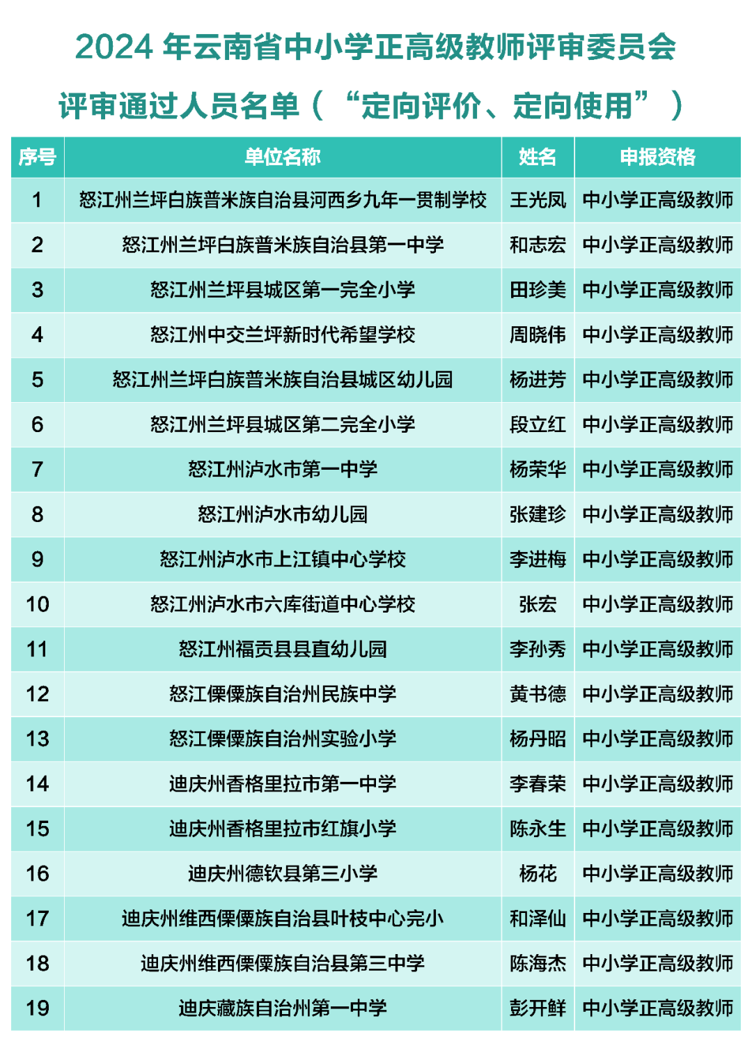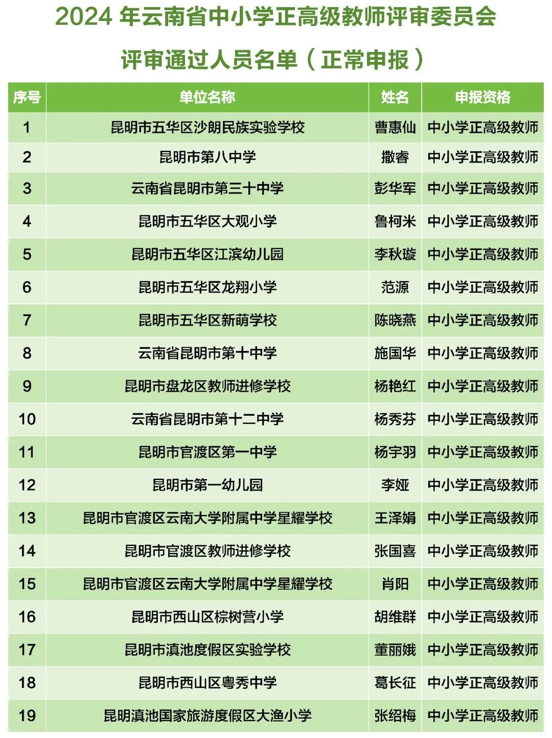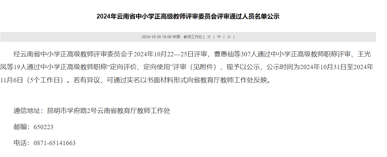 6686体育讯 记者上官艳君 10月30日,云南省教育厅公示了《2024年云南省中小学正高级教师评审委员会评审通过人员名单》,其中,通过中小学正高级教师职称评审的有307人,通过中小学正高级教师职称“定向评价、定向使用”评审的有19人。