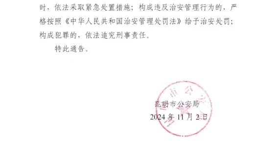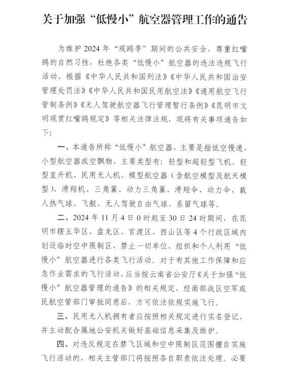 11月4日至30日期间,在昆明市辖五华区、盘龙区、官渡区、西山区等4个行政区域内划设临时空中限制区,禁止一切单位、组织和个人利用“低慢小”航空器进行各类飞行活动。对于有其他工作保障和应急作业需求的飞行活动,应当按云南省公安厅《关于加强“低慢小”航空器管理的通告》的相关规定,经南部战区空军或民航空管部门审批同意后,方可依法依规实施飞行。