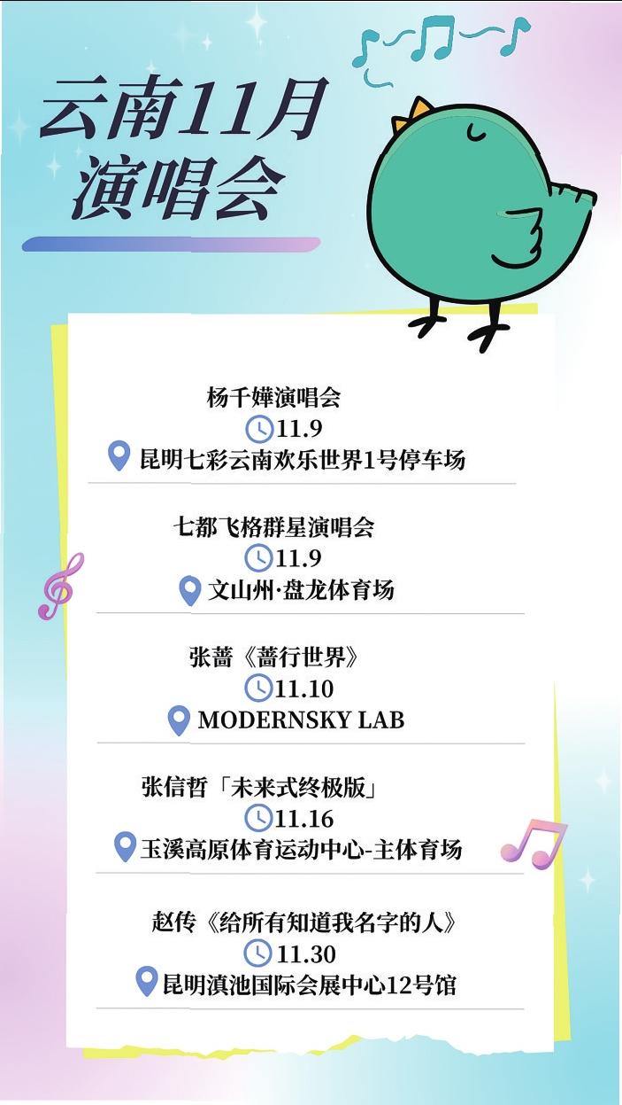 除了大家耳熟能详的杨千嬅、张信哲等歌手,还有不少乐队、个人歌手在云南开展演出活动,包括沼泽乐队、野孩子乐队、新秀等;还有二十四伎乐戏剧、哈利波特电影名曲等音乐会等等。11月的云南,音乐无处不在,无论是流行金曲还是民谣经典,都将在这个月里得到完美的呈现。(春城晚报 记者邓莎莎)