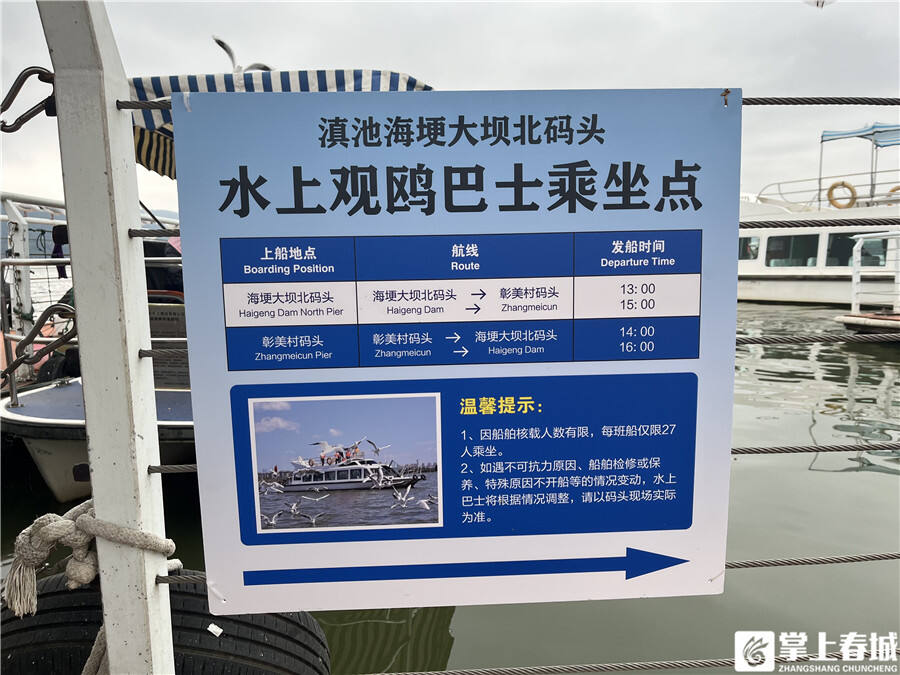 据运营中心钟姓工作人员介绍,“水上观鸥巴士” 每天4趟,其中海埂大坝北码头于13点和15点开船,彰美村码头则为14点、16点间开船,单程行驶时常30分钟左右,每班船承载量为27人。