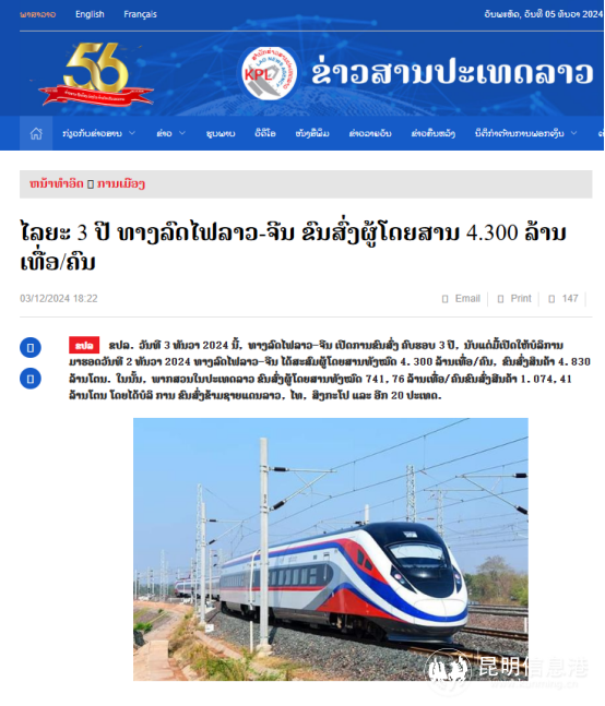 老挝《巴特寮报》在12月3日的特别报道中,公布了中老铁路三周年运营的辉煌成绩单:累计运输旅客已超过4300万人次,货物运输量达到4830万吨。这一骄人业绩不仅充分展示了中老铁路的强大运输能力和高效运营效率,更有力证明了其在推动中老两国及区域经济发展中的核心作用与战略价值。