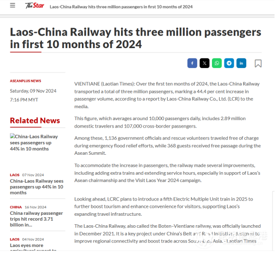 马来西亚《星报》11月9日报道了《2024年前10个月,中老铁路旅客量突破300万人次》的喜讯,聚焦中老铁路客运量的快速增长。报道指出,2024年前10个月,中老铁路累计运输旅客已达300万人次,同比增长势头强劲。这一数据不仅彰显出中老铁路在促进区域互联互通方面的显著成效,也预示着其在推动旅游业发展方面的巨大潜力和广阔前景。